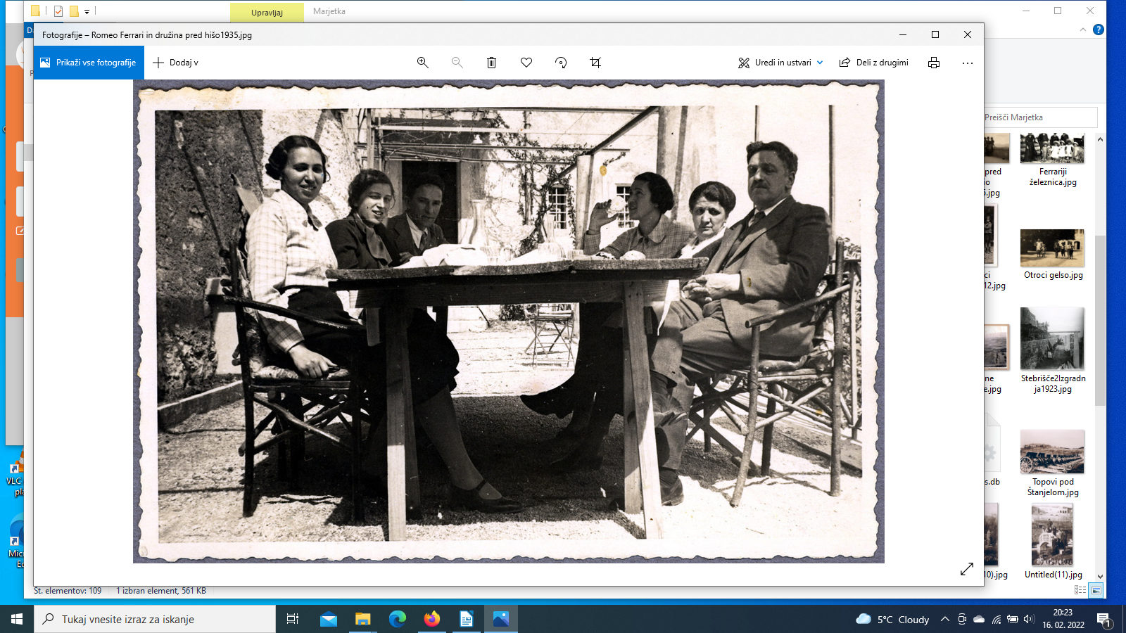Družina Romea Ferrari na terasi svoje počitniške hiše v Štanjelu med velikonočnimi prazniki leta 1935. Vir: Arhiv Ustanove Maks Fabiani, Štanjel